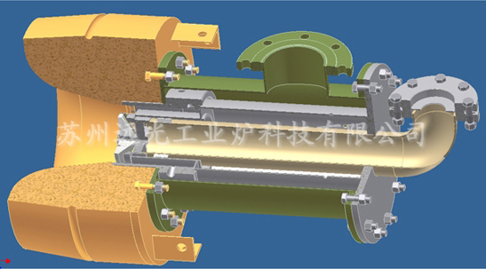 燃氣平焰燒嘴一般安裝在爐頂,煤氣由頂部引入燒嘴內(nèi)管,經(jīng)導流片使氣流旋轉(zhuǎn),然后從燒嘴頭成一定角度噴出??諝庥蓚?cè)部進入燒嘴外管,經(jīng)切向布置的導流孔后,旋轉(zhuǎn)的氣流在燒嘴頭部與旋轉(zhuǎn)的煤氣氣流混合燃燒,由于貼附效應,氣流沿特殊設計的燒嘴磚內(nèi)壁向四周鋪展,從而形成貼附于爐頂呈薄層圓盤形火焰,它具有很多優(yōu)點:首先,可以降低爐膛的高度,爐頂形成一個溫度均勻的輻射面,使工件受熱加溫非常均勻,即使在加溫薄板時也不會產(chǎn)生局部過熱。其次,它的加熱速度快,熱利用率高。平焰火焰緊貼爐壁,它與爐壁的對流和輻射換熱強度都很大,這樣就提高了爐壁的溫度。爐壁溫度的提高將增加通過輻射傳給工件的熱量,一般能增加10%~20%。平焰火焰中心都有一個固定的回流區(qū),能造成穩(wěn)定的煙氣回流。因此,平焰燃燒的煙氣污染較小,煙氣中的NOx含量也低。